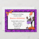 A Halloween birthday invitation with owls in tree with pumpkins, birthday cupcake, balloons and purple polka dot border with bow. Perfect for girls and boys of all ages. Just personalize the text with your party details.