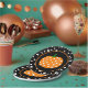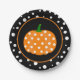 Halloween party paper plate is shown in a black and white polka dots design with a pumpkin print.