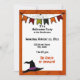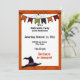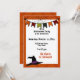 Personalize the front and back of this Halloween party invitation in swirly orange, accented with decorative party banner, cute witch hat and a spider web. Just edit your details in the easy zazzle text editor. Add plates, cups, napkins and more from a large mix and match collection that coordinates with this design.
