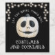 A creepy gothic Halloween white pumpkin with sunken black eye sockets and a stitched mouth, with the phrase: "let the ghoul times roll", and the party theme: costumes and cocktails. Black and white and scary!