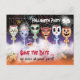 Six wine goblets with spooky, creepy faces are the main feature on this Halloween, Save the Date, party invitation. Behind them, entwined in cobwebs, lurks two bulging bloody eyes. Part of a scary witch and black cat can be seen through thick white smoke in the foreground, and a caption reads, Save the Date ... or miss at your peril. Cats eyes are also on the back of the card which is solid black.
