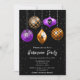 This elegant and glamourous holiday party invitation features orange and purple Halloween bauble ornaments on a black background. The text combines handwritten script and modern sans serif fonts for a classy and sophisticated look. The sparkles and glitter add a festive and magical touch.