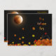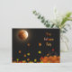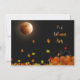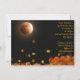 Black cat in pumpkins with fall leaves and full moon for Halloween party invitation.