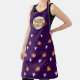 This spooky Halloween apron is decorated with funny pumpkins, ghosts, bats and scary eyes on a dark purple background imitating Halloween night.
