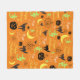 Cute and spooky orange pattern Halloween blanket or throw. Orange background with a colourful "Happy Halloween", pumpkin, ghost, witch, moon, black cat pattern. Perfect to keep you warm during the Halloween season!