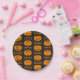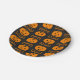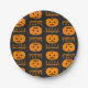 A Halloween paper plate with pumpkins and a 'Happy Halloween' text.