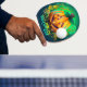 A ping pong paddle with a Halloween design, featuring a cartoon pumpkin with a smiling face and glowing eyes, set against a green and blue background with swirling vines and clouds, the word "HALLOWEEN" is written in a stylized font at the bottom of the paddle, the handle of the paddle is made of light-coloured wood with vertical grain patterns.