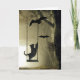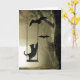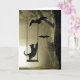 Black cat on a tree swing in a spooky evening plays with the swarming bats and invites you to join in Halloween greeting card