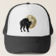Custom Trucker Style Baseball Hat In Black And White Colours casual fun fashion statement accessory printed with a Halloween Prowling Black Cat On A Full Moon Night hand drawn graphic artwork drawing design illustration by TheFabricSeal print on demand shop at Zazzle.com #ZazzleMade ©️Original. https://www.zazzle.com/store/thefabricseal
