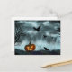 Vibrant Halloween design featering a glowing pumpkin with bright eyes and teeth in a dark landscape with trees and ravens.
