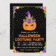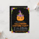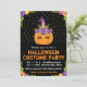 Adorable orange pumpkin with a gold unicorn horn and a purple witches hat. The black background has orange, yellow, green and purple Halloween confetti and floral flowers and leaves in the corners.