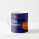 Happy Halloween mug with pumpkin and cool black cat, witch flying on broomstick in the moon, and cool bats
