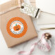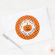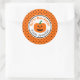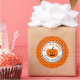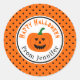 Halloween sticker gift tags with a pumpkin lantern and orange and black polka dot background. The "Happy Halloween" greeting and who it is from can be changed.
