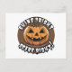 A cartoon-style illustration of a jack-o'-lantern pumpkin with a wide, toothy grin. The pumpkin is orange with a brown stem and is set against a brown background. The pumpkin's eyes and nose are carved out, creating a spooky expression. The text "Shine Bright Scare Right!" surrounds the pumpkin in a white, jagged font, adding to the festive and slightly menacing mood of the image.