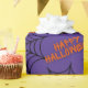 This adorable wrapping paper for Halloween has spider webs and spiders on a purple background. Orange Happy Halloween text.