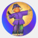 Cute Halloween Scarecrow and full moon on deep blue and purple background. Black crow resting on his shoulder