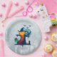 Paper plates with a cool halloween illustration. Set on a grey grunge background. A large scarecrow with a pumpkin head, wearing a witches hat. He has a menacing grin wearing tattered robes and is standing in a graveyard with a crow screeching on his arm. Bats flying off in the distance, a full moon in the background and a lone owl with glowing eyes sits on a tombstone.