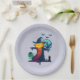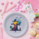 Paper plates with a cool halloween illustration. Set on a grey lavender grunge background. A large scarecrow with a pumpkin head, wearing a witches hat. He has a menacing grin wearing tattered robes and is standing in a graveyard with a crow screeching on his arm. Bats flying off in the distance, a full moon in the background and a lone owl with glowing eyes sits on a tombstone.