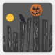 Halloween scene with pumpkin and crow sitting on a fence on a spooky full moon night on square sticker.