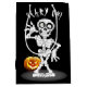 Funny Halloween skeleton with a flaming pumpkin on black background.