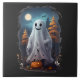 In the heart of an autumn forest, under a night sky lit by a full moon, a smiling ghost stands proudly. Its white sheet floats gently in the breeze, scattered with spots and holes that add to its spectral charm. At its feet lies a carefully carved pumpkin, whose illuminated eyes and mouth cast a warm glow on the forest floor. Fallen orange leaves surround the scene, while silhouetted bats fly in the distance, completing this visual celebration of the Halloween spirit.