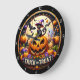 This image features a round wall clock with a festive Halloween theme. The clock face is adorned with various spooky but friendly characters and elements. A prominent carved pumpkin with a smiling face is at the bottom centre. Perched on top of the pumpkin is a black cat wearing a purple witch's hat. Surrounding these main figures are bats flying under a crescent moon, a friendly white ghost, a witch's broom, and numerous pumpkins and colourful flowers in shades of orange, purple, and green. The phrase "TRICK or TREAT" is displayed prominently on a banner at the bottom. The clock has a black frame with white numbers from 1 to 12.