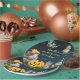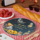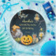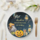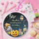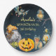 Halloween spooky spooktacular birthday party tableware personalized template plates, Halloween pumpkin, bat, owl, cat, brewing pot starry night sky black background.