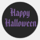 Round sticker shown in black/purple colours with Happy Halloween. Customize this item or buy as is.