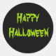 Round sticker shown in black/green colours with Happy Halloween. Customize this item or buy as is.