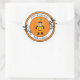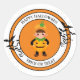 This large size round sticker is shown in a cute festive Halloween pumpkin child print.