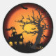 Round shape sticker shown in a Halloween haunted house print. Customize this item or buy as is.