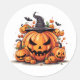 Round sticker is shown with a festive Halloween pumpkins art print.