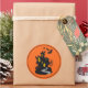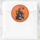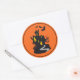 Large round sticker shown with a Halloween haunted house print.