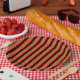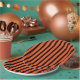 This Halloween paper plate is shown with a festive black and orange stripes design.