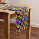 Halloween table runner is shown with a colourful pumpkins print.