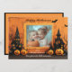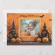 Flanking the photo are towering haunted houses, eerie jack-o’-lanterns, and sneaky bats that set the perfect Halloween tone. The torn-paper effect along the edges gives just the right amount of spooky charm, as if the card itself is part of a mysterious spellbinding parchment. The words Happy Halloween elegantly float above the scene, ensuring the recipient gets into the spirit before they even reach the candy stash.