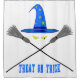 Drawing of a blue wizard's hat, decorated with yellow stars and two crossed witch's brooms under the hat. Demonic yellow eyes between the hat and brooms and a text Treat or trick. Funny Halloween theme. Eat, drink and be scary. Shower curtain to decorate your bathroom for fun and good mood. Do not forget to change the colour of the curtain.