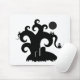 Silhouette of a whimsical tree with big-eyed owls sitting on the curly branches with a couple of gravestones visible below. A black silhouetted moon can be seen in the distance.