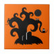 Silhouette of a whimsical tree with big-eyed owls sitting on the curly branches with a couple of gravestones visible below. A black silhouetted moon can be seen in the distance. Orange background.