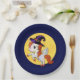 Festive holiday paper plates for Halloween featuring a Unicorn Pegasus with an orange mane, tail, and hoofs and a candy cor-coloured horn. Unicorn is is wearing a witch's hat with a spider dangling off the end. Yellow Full moon with a dark purple border.