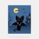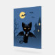 Belle caricature de chat noir avec ailes ressemblant à des chauves-souris. Un arbre mort, un manoir déplaisant, des chauves-souris et la lune sont vus sur l'arrière - plan.