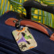 Halloween vintage pattern luggage tag that includes knife, witch, and bats to add to your Halloween travel accessories collection.