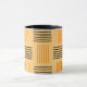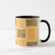 This mug has a mid-century modern design that looks like a weave with orange and black lines on a field of pale orange.