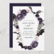 Halloween October 31st Autumn Fall Dark Watercolor Purple and Green Wedding Invitations on Black background - includes haunting and scary elegant script typography with modern Flowers and Bat Wings for the special Creepy Wedding day celebration.