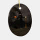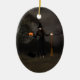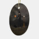 This Halloween ornament design features a witch, with broomstick in one hand and pumpkin in the other, complete with her 'familiar' (the black cat) at her feet,and a spooky tree in the background.