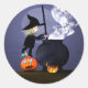 Stickers for Halloween with my artwork of a little witch standing on a pumpkin stirring her boiling cauldron.