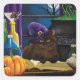 A magical brown chocolate coloured cat wearing a purple witch hart sitting on books. Cauldron, pumpkins, potions, and wand sit amongst the cat.