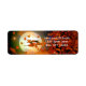 A Halloween return address label with a witch flying past a full moon with fall leaves.