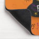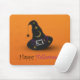 Happy Halloween illustration featuring a witch hat with golden stars and moon and a hanging spider on an orange background with jack-o-lantern pattern shapes.