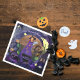 This Whimsical design features a witch in a purple dress making a brew. A black cat, a cute owl, and a few pumpkins are hanging from the trees, spiders crawling from the spider nets. The rich background is Orange, green, brown, and predominantly purple with the castle tree in the background. Great way to add some purple to your Halloween/ Birthday table decor. There is a matching cup and plate. Check the Halloween birthday collection to find more party items.